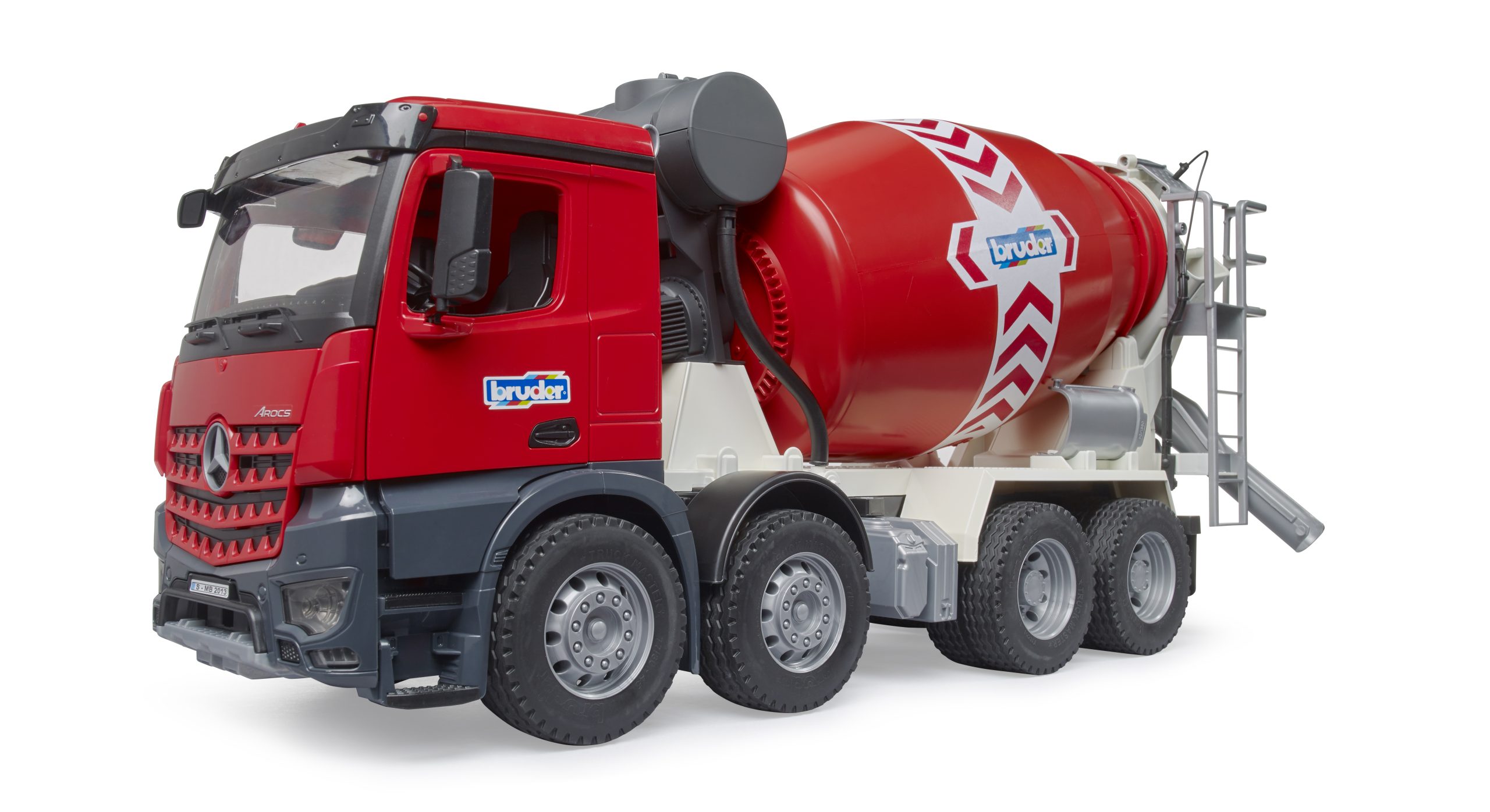 Jauda, izturība un efektivitāte ir svarīgas ceļu un būvniecības darbos, tāpēc Mercedes-Benz Arocs ir īpaši izstrādāts šīm prasībām ar jaunu dizainu un tipisko Arocs radiatora resti. BRUDER modelī kabīne ir ar atveramām durvīm, bet betona maisītāja cilindru var griezt ar nolokāmo rokas kloķi ūdens tvertnē (cilindrs ar spirālveida konveijeru un maisītāju). Tāpat kā īstajā, cilindrs tiek iztukšots, apgriežot griešanās virzienu, un spirāle iekšpusē novada maisījumu uz izlādes kanālu aizmugurē. Komplektā divi pievienojami izlādes kanāli.